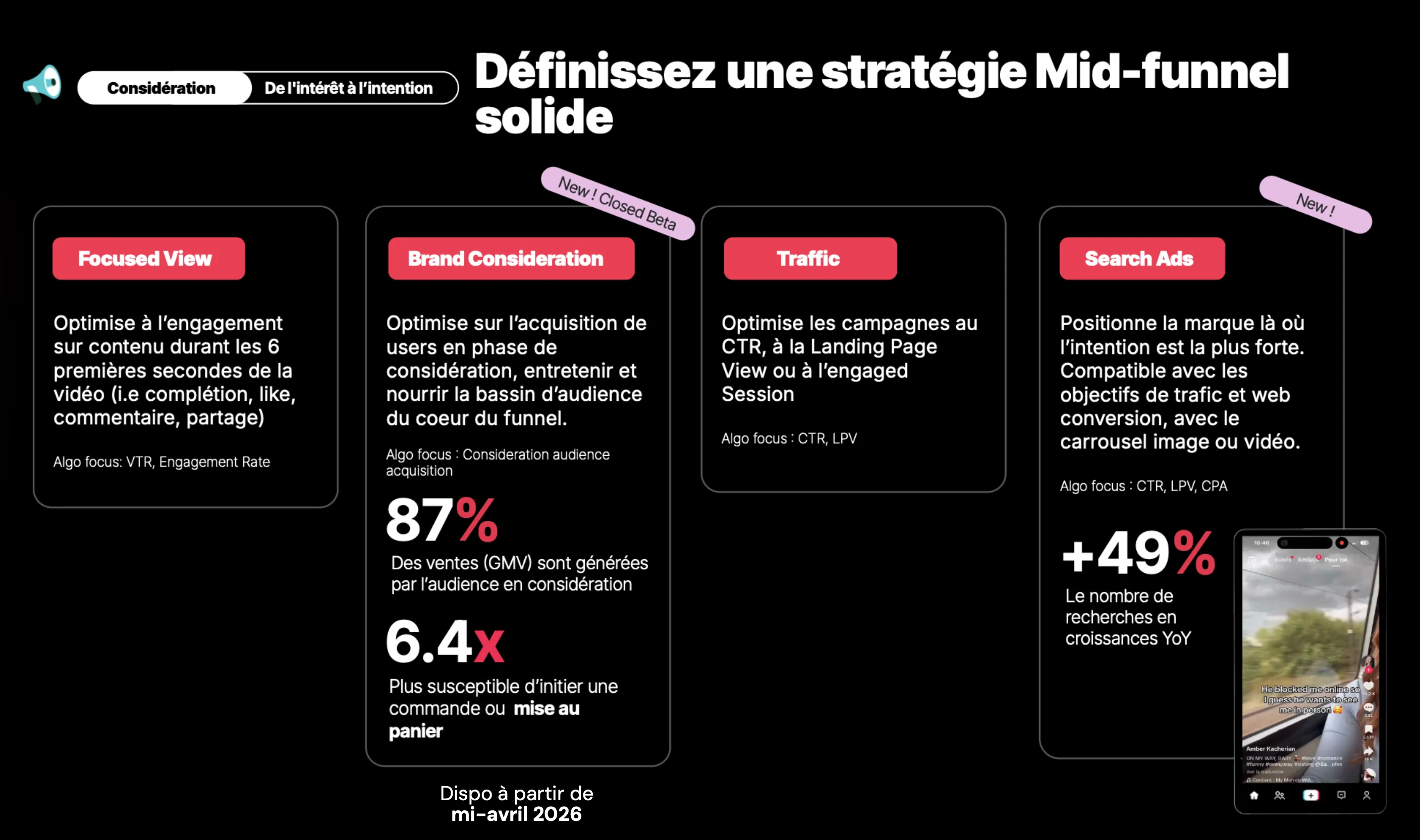 - Brand Consideration (mi-avril 2026) : entre Focus View et Traffic, il cible les utilisateurs en phase de considération pour nourrir le bassin d’audience.